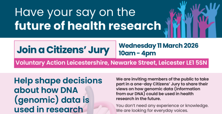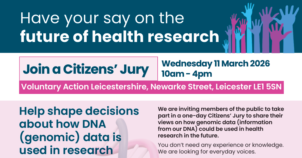 Health Innovation East is inviting people from across the East Midlands and East of England to take part in a one-day Citizens’ Jury to share views on how DNA (genomic) data could be used in health research in the future.